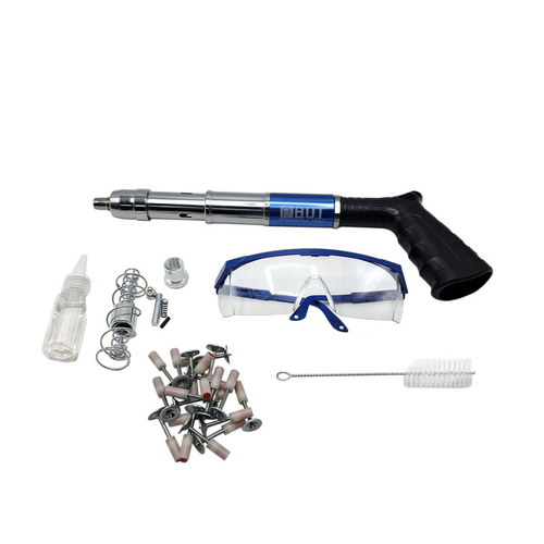مشخصات میخکوب بتن و آهن (میخ با چاشنی انفجاری) امکان استفاده در بتن، پلاستیک، ورق های نازک فلزی، چوب و ... را دارد xقابلیت استفاده میخ تا 5 سانتیمتر را دارد xکارکرد ساده و قوی دارد xبدون نیاز به چاشنی انفجاری جداگانه می باشد xبسیار سبک، کم حجم وقابل حمل می باشد xمحصولی جدید و با تکنولوژی به روز جهت جایگزینی برای میخکوب های والتی، کامرکس و ... می باشد xبدون نیاز به چاشنی انفجاری می باشد xدارای کیف حمل، عینک، فرچه، فنر یدک .50 عدد میخ چاشنی. روغن می باشد تفنک میخکوب ابزاری است مشابه تفنگ بادی است. تفنگ میخکوب بتن برای اتصال پلیت ها و صفحات مختلف به بتن می باشد. البته مصارف دیگری از جمله اتصال انواع توری های مشبک و غیره به صفحه های بتنی و مصالح ساختمانی را نیز دارد. این تفنگ ها به وسیله چاشنی میخ موجود در خان تفنگ را با شدت به سمت هدف شلیک کرده و واشری که بر روی میخ قرار دارد صفحه را بر روی بتن نگه می دارد. با قرار دادن چاشنی مخصوص در داخل دستگاه و قرار دادن میخ در محل تعیینشده، میتوانید از این ابزار استفاده کنید. چاشنیهایی که برای این محصول در نظر گرفتهاند در دو نوع و برای کوبیدن میخ در فلز یا بتن هستند. نوع میخی که برای این دستگاه مورد استفاده قرار میگیرد، از گونههای واشردار است. از این دستگاه در شغلهای مختلف که با چوب و فلز سروکار دارند، استفاده میکنند.